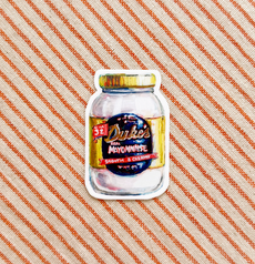 Duke's Mayonnaise stickers based off of artist Emily Furr's paintings of the iconic Duke's Mayonnaise jar. These stickers measure 1.95" wide by 3" tall. They are waterproof stickers and would look cute on a water bottle, car bumper and anywhere else you'd want a tiny jar of Duke's mayo.
